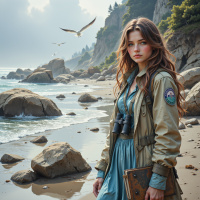 The image features a young woman standing on a rocky beach. She has long brown hair and is wearing a jacket with an insignia, possibly indicating she might be part of some organization or group. To her right, there are rocks jutting out into the water. On the ground near her feet is what appears to be a book or a notebook open. Above her head, two seagulls are in flight, adding a dynamic element to the scene. The overall setting suggests a coastal environment during daytime with a clear sky and calm sea conditions.