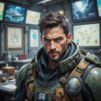 На картинке изображен мужчина в, судя по всему, футуристическом окружении, возможно, в диспетчерской или лаборатории. У него небритое лицо, короткие темные волосы и на нем тактический жилет или броня с множеством карманов и отделений. На лице выражение суровости. На заднем плане – различное оборудование и технологии, включая экраны с неразборчивой информацией, карты и схемы на стенах. Одежда персонажа говорит о том, что он, вероятно, солдат или оперативник, готовый к действиям или боевым действиям.