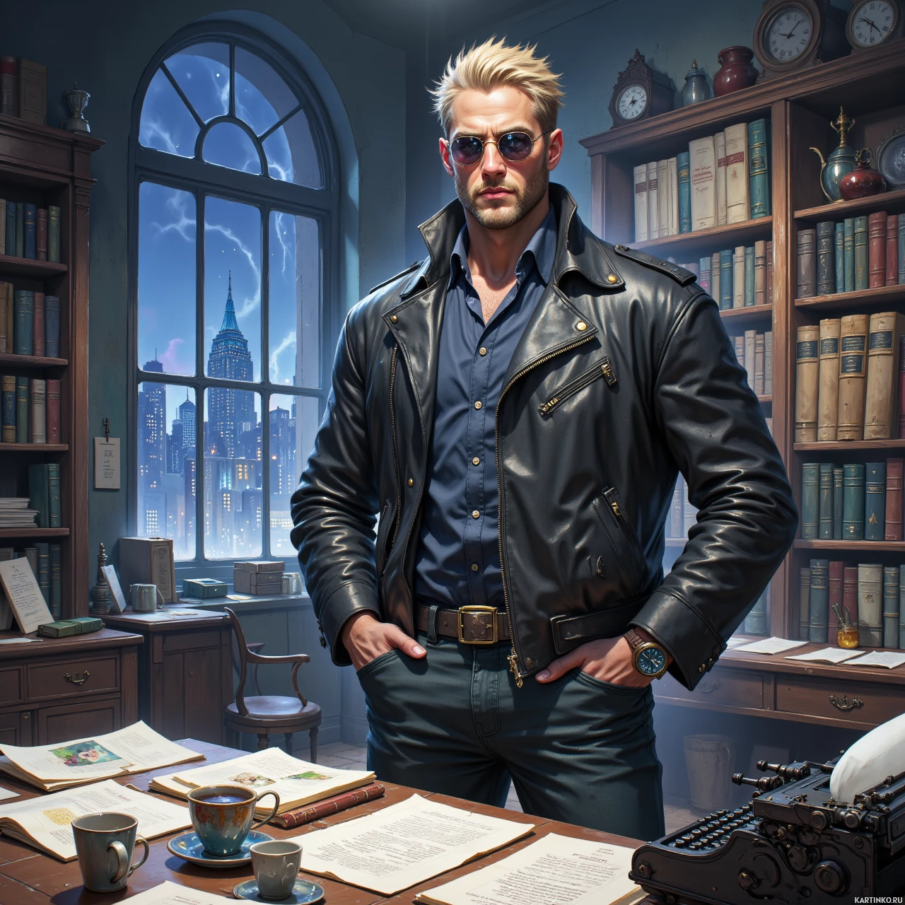 На картинке мужчина стоит в офисном помещении ночью, как видно по темноте за окном и приглушенном свете в комнате. На нём солнцезащитные очки и кожаная куртка с воротником, что придает ему стильный и уверенный вид. Он засунул руки в карманы куртки и смотрит в сторону. Вокруг него – хорошо обставленный офис. На заднем плане – книжные полки, намекающие на место учебы или исследований. Справа от мужчины – стол, заваленный бумагами, и стул за ним. Слева – еще одна полка с книгами и, похоже, старая пишущая машинка на небольшом столике. Общая атмосфера картинки таинственная и немного в стиле нуар, благодаря темноте и стильной одежде мужчины.