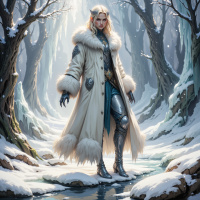 На картинке изображена блондинка, стоящая в заснеженном лесу. На ней меховое пальто и сапоги – обычная одежда для холодной погоды. У неё на поясе надет меч, что намекает на какое-то путешествие или приключение. В левой руке она держит, похоже, амулет или кулон. Лес вокруг неё освещён мягким светом, словно это раннее утро или поздний вечер, что придает сцене спокойную, но немного зловещую атмосферу.