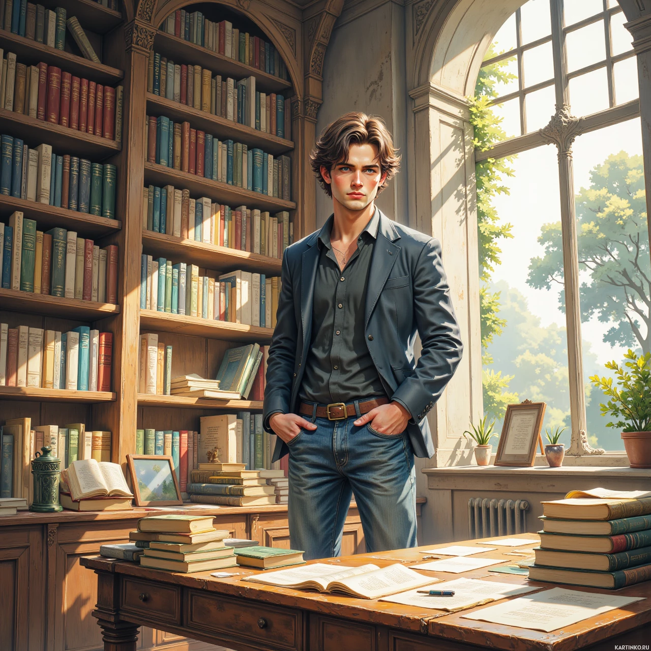 На картинке изображен молодой человек, стоящий в том, что похоже на старинную библиотеку или кабинет. У него темные волосы и серьезное выражение лица. На нем темная куртка с подвернутыми рукавами поверх светлой рубашки и джинсы. Руки в карманах, ноги слегка расставлены. В интерьере – книжные полки, заставленные книгами; по корешкам можно предположить разные темы и жанры. Комната пронизана атмосферой старины: деревянные панели, возможно, стол, на котором видны бумаги или документы. В углу стоит в горшке растение, дополняющее академический колорит. Освещение говорит о том, что сейчас поздний вечер или раннее утро. Общий стиль картинки – реалистичный, с вниманием к деталям, особенно к текстурам и атмосфере места.