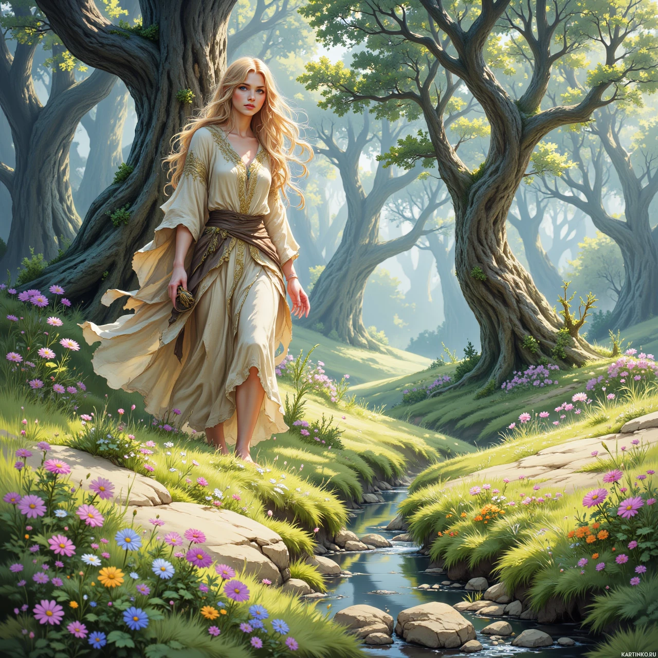 На картинке изображена юная девушка, похожая на сказочная принцесса. У нее светлые волосы и длинное, струящееся платье, ниспадающее до земли. На ее лице – выражение грусти или задумчивости, она смотрит вдаль с легкой хмуростью. Вокруг нее – деревья с густой зеленой листвой, что указывает на лесной пейзаж. У ее ног видны небольшие цветы, добавляющие естественности и умиротворения в атмосферу сцены. Освещение намекает на то, что это либо утро, либо день, судя по мягкому свету, не отбрасывающему резких теней.