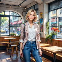 The image shows a woman standing indoors, seemingly in a cafe or restaurant setting. She has blonde hair and is wearing a light pink blazer over a white top with the shirt unbuttoned at the collar. Her accessories include what appears to be a watch on her left wrist. She has blue jeans and black boots, and she's carrying a handbag that matches the color of her blazer. The woman is looking directly at the camera, giving a neutral expression. The interior decor includes exposed brick walls and industrial-style lighting fixtures on the ceiling. There are windows with red frames to the right of the frame, and they are open, allowing natural light into the space. A street can be seen through the windows, indicating that the cafe is located at a corner or an intersection. The environment suggests a casual, contemporary vibe, possibly in an urban area.