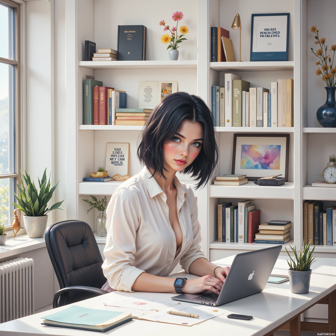 На картинке молодая женщина сидит за столом в офисе. У неё короткие тёмные волосы, и она смотрит прямо в камеру с нейтральным выражением лица. На столе перед ней – ноутбук, на котором она, кажется, работает или использует его. На столе также несколько книг, что говорит о рабочей зоне для чтения или справочных материалов. Справа от женщины – книжный шкаф, заполненный книгами и рамками с фотографиями. В комнату попадает естественный свет из окна, находящегося слева, а горшечные растения добавляют немного зелени. В целом, создаётся впечатление организованного и профессионального пространства.