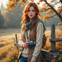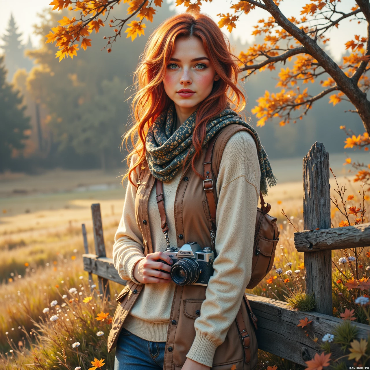 На картинке запечатлена молодая женщина, стоящая на фоне размытого пейзажа, похожего на осенний лес с деревьями в багряно-золотой листве. У нее короткие, ярко-рыжие волосы, и она смотрит прямо в камеру с невозмущенным выражением лица. На ней бежевый вязаный свитер, коричневый жилет и синие джинсы. Аксессуары включают серый шарф, повязанный на шее, и рюкзак, перекинутый через плечо. Кажется, она держит фотоаппарат, возможно, делает или собирается сделать снимок.