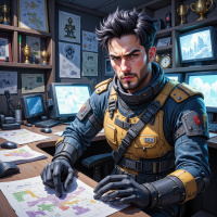 На картинке изображён мужчина, сидящий за столом в офисе. У него борода и усы, выражение лица говорит о сосредоточенности или раздражении. На нём шлем с визором и, кажется, разгрузка на груди, что указывает на его возможную причастность к специальным операциям или тактической работе. На столе вокруг него — документы, карты и компьютерное оборудование, включая мониторы и клавиатуры. Окружающая обстановка детализирована и не лишена личных штрихов: на стене висят фотографии семьи и рамки с сертификатами.