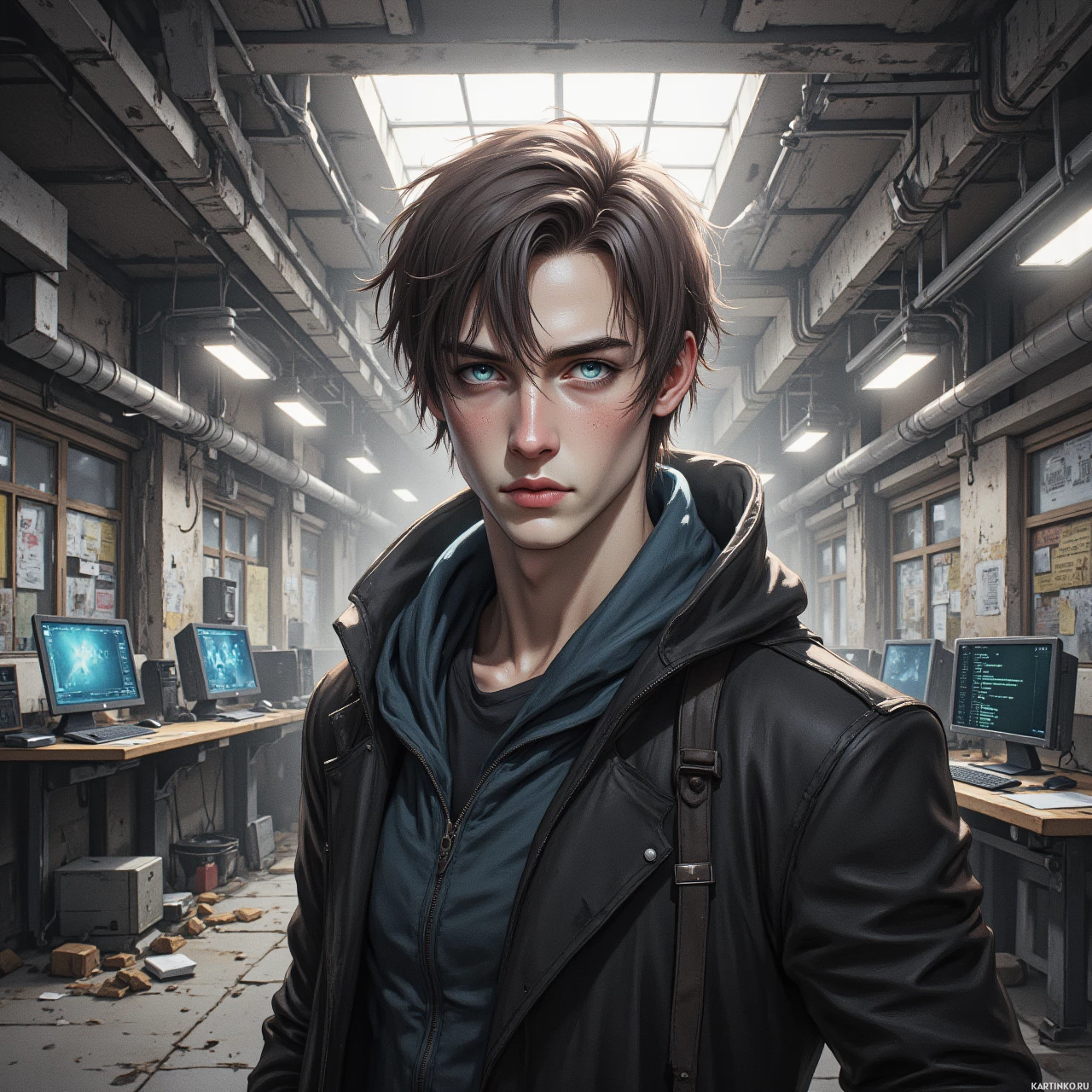 На картинке изображен молодой человек с короткой коричневой стрижкой, уложенной в небрежный пробор. У него светлая кожа и голубые глаза с выраженным красноватым оттенком во внутреннем уголке – признак гетерохромии, когда у человека глаза разных цветов. Выражение лица нейтральное, с легкой серьезностью. На нем черная куртка поверх темной футболки или майки. Вокруг шеи – разное техническое оборудование, включая гарнитуру и, возможно, другие электронные устройства. Он стоит в индустриальном помещении с бетонными стенами, вдоль потолка видны трубы, а позади него на столах – компьютерные мониторы. Освещение приглушенное, выделяя его фигуру на темном фоне.