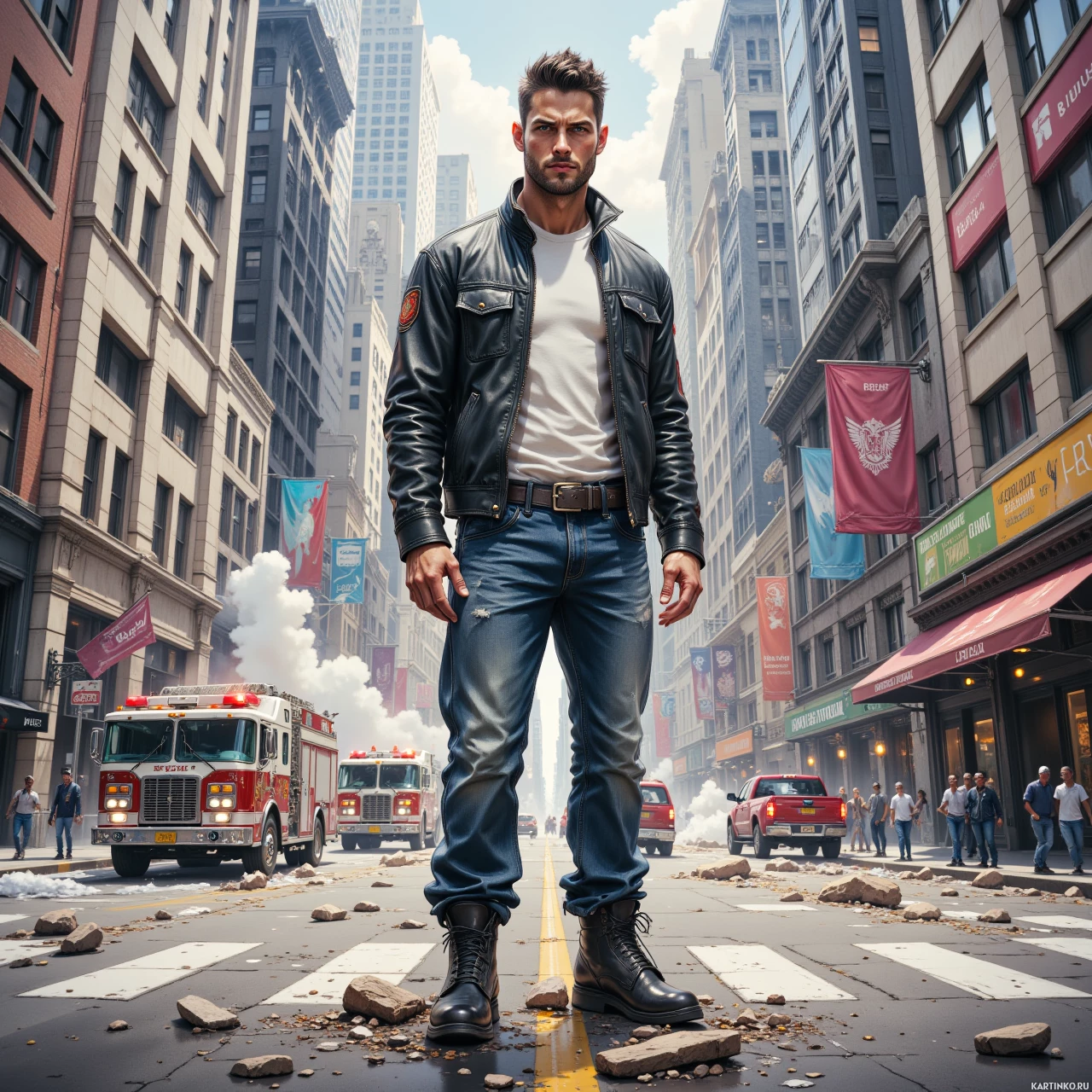 На картинке мужчина уверенно стоит на груде обломков, по-видимому, на городской улице. На нем кожаная куртка и синие джинсы, он выглядит суровым и решительным. За его спиной выстроились здания, украшенные вывесками и баннерами, что характерно для городского пейзажа. На заднем плане, среди хаоса, видна пожарная машина, намекающая на недавнее происшествие. Взгляд мужчины направлен на зрителя, выражая стойкость и решимость на фоне разрухи.