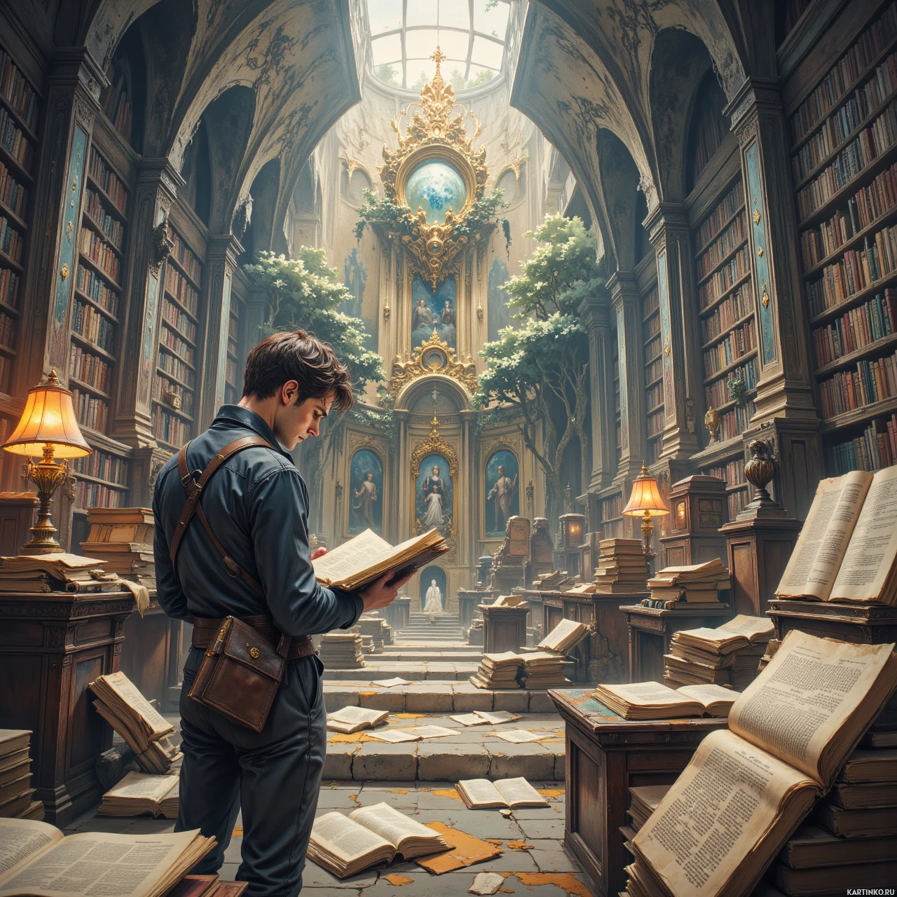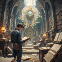 На картинке запечатлен молодой человек, стоящий спиной, в роскошной библиотеке. На нём тёмный пиджак, а в руках раскрытая книга. Комната заполнена книгами разных размеров: одни аккуратно расставлены на полках, другие разбросаны по полу. Большие окна пропускают естественный свет, заливая помещение. На заднем плане – богато украшенный алтарь или святилище, украшенное религиозными иконами и окружённое книгами. Атмосфера пронизана духом знаний, открытий, или, возможно, намекает на сюжет из мира фэнтези или учености.