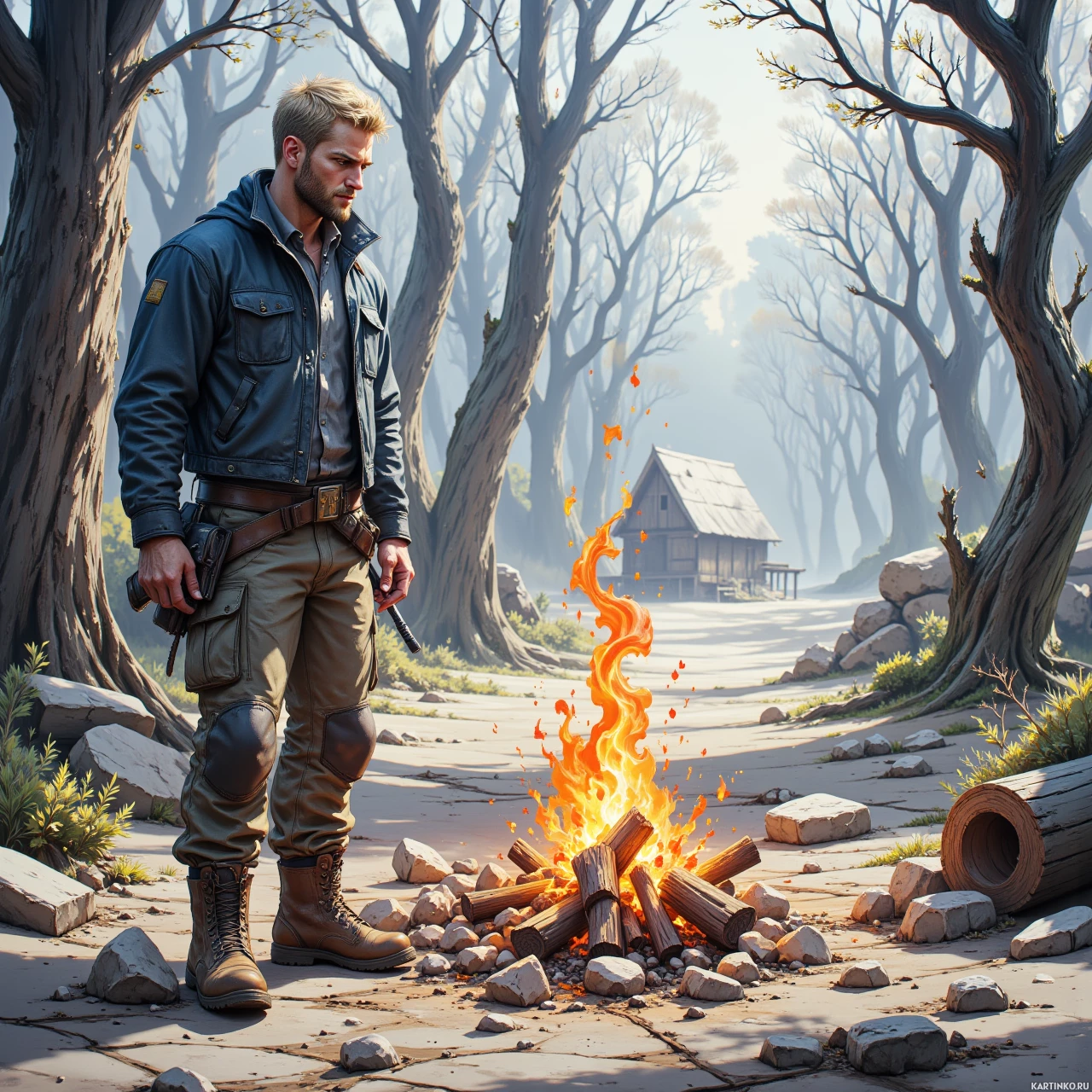 На картинке мужчина стоит на кемпинге, вероятно, в лесу. Он одет в теплую одежду для холодного климата и засунул руки в карманы куртки. Его взгляд направлен в сторону, на лице – серьезное выражение. Справа от него весело потрескивает небольшой костер возле поваленного бревна, согревая и освещая кемпинг. Окружающая среда, с голыми деревьями, наводит на мысль, что это конец осени или начало весны.