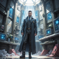 A man in a suit standing inside a room filled with electronic equipment. The man has a mustache and is wearing a tie. There are monitors displaying graphs on the wall behind him. The overall setting suggests a science fiction scenario, possibly a character from such a genre in the context of his duties or investigation.