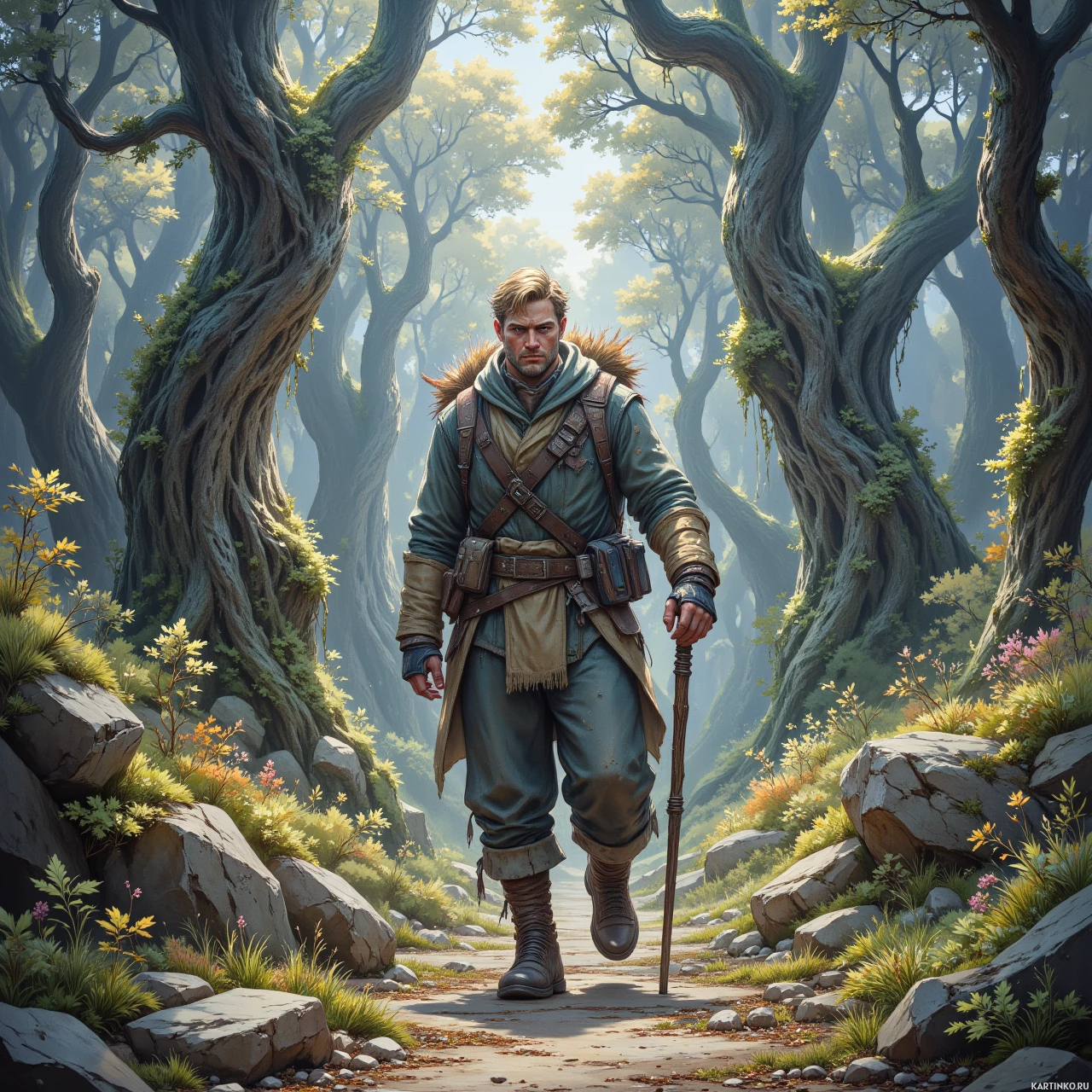 На картинке изображён мужчина, стоящий на тропинке, словно в лесу. На нём накидка с кожаными доспехами, за спиной колчан со стрелами, а в правой руке посох. Его наряд указывает на фэнтезийную или приключенческую тематику. За его спиной тропинка окаймлена высокими деревьями с переплетающимися ветвями. Свет, пробивающийся сквозь листву, создаёт спокойную атмосферу.