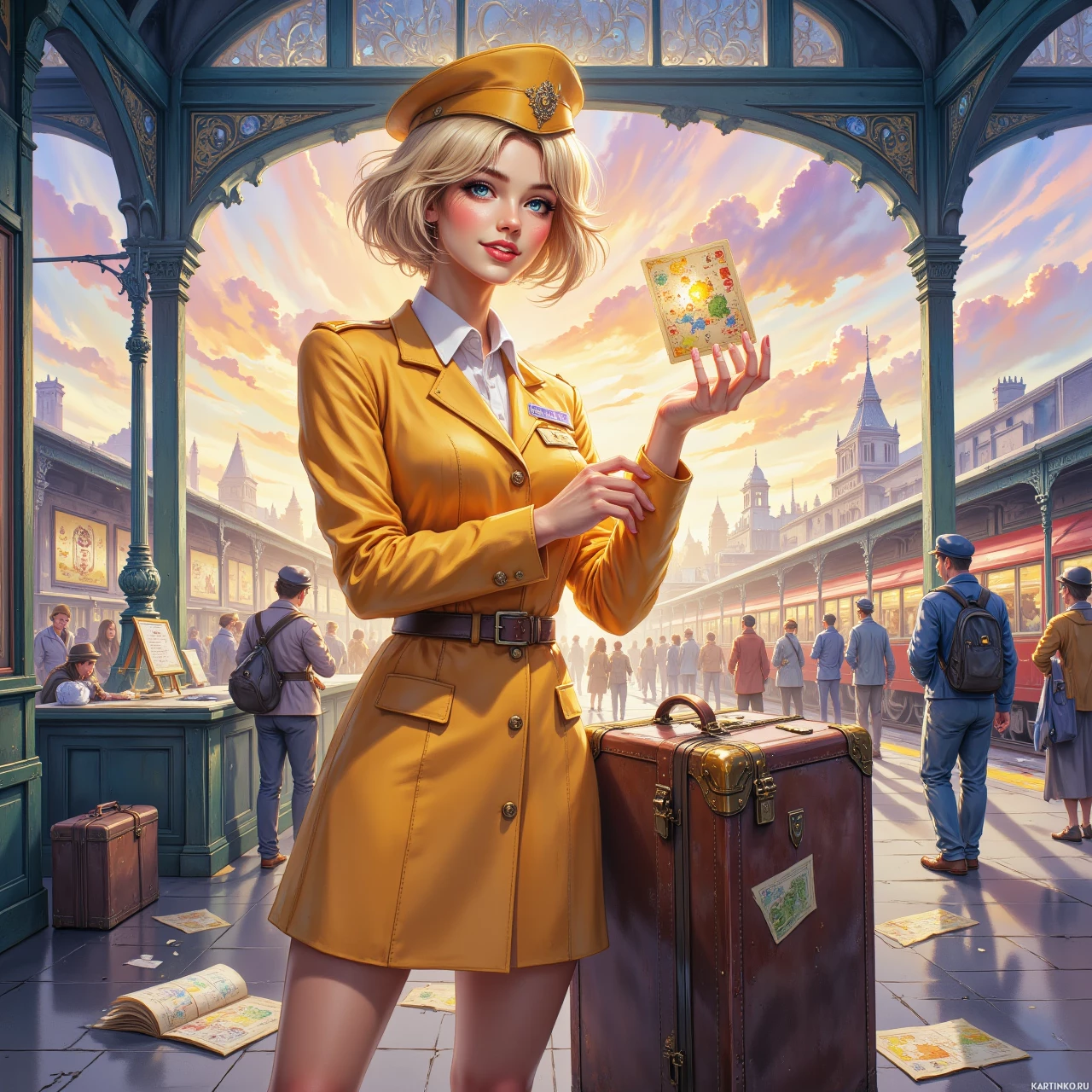 В центре этой картинки выделяется блондинка с выразительными голубыми глазами на фоне яркого фона. На ней жёлтая форма, контрастирующая с её светлыми волосами, что намекает на роль, связанную с властью или обслуживанием. В руках она бережно держит небольшую белую карточку с розовым цветком, представляя её с вниманием и заботой. Действие разворачивается на оживлённом вокзале на закате. Архитектура сложная, напоминает европейский город. Люди разбросаны по всей сцене, некоторые с чемоданами и сумками, что говорит об их статусе как путешественников или пассажиров. Цвета в картинке насыщенные и разнообразные, доминируют оттенки жёлтого и синего, создающие ощущение либо восхода, либо заката. Общая атмосфера пронизана ожиданием и движением, что характерно для шумного транспортного узла.