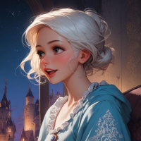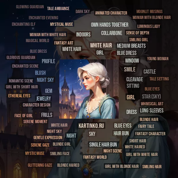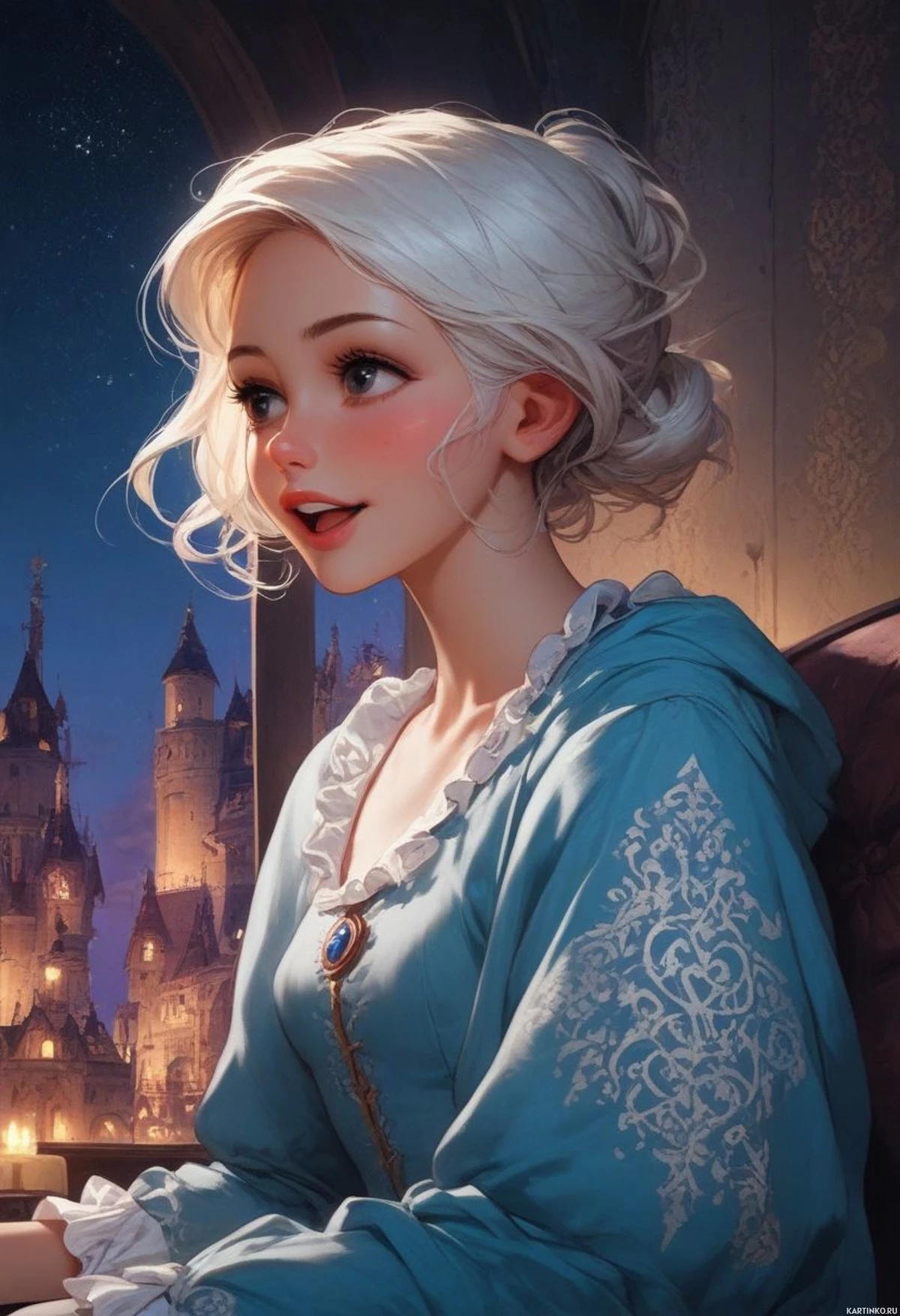 castle scene at dusk or nighttime, with the stars twinkling in the sky above the silhouetted spires of the castle. The girl's placement in front of the castle creates