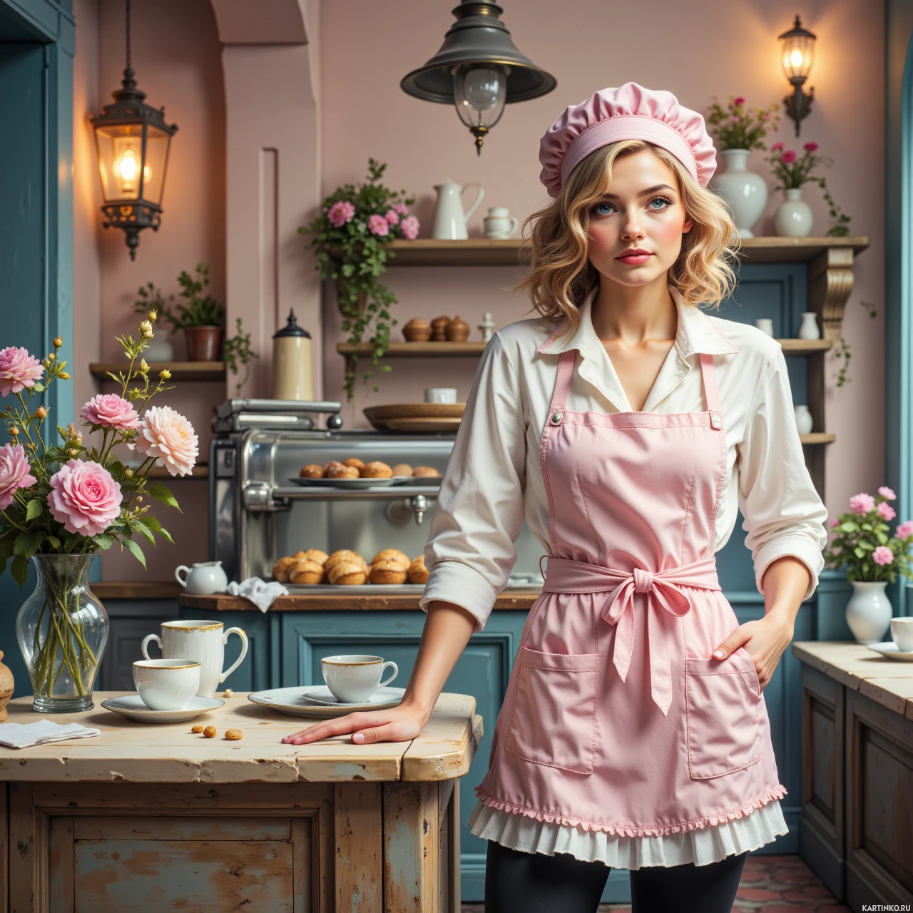 На картинке молодая женщина с светлыми волосами стоит в центре хорошо оборудованной кухни. На ней розовый фартук и розовый платок, что наводит на мысль, будто она собирается готовить или печь что-нибудь. Кухня полна предметов, указывающих на приготовление еды: банки с надписью "мёд", несколько тортов на столешнице, чайник, ждущий своего часа, и ассортимент чашек, возможно, для подачи напитков. Ваза с розовыми цветами добавляет красок в интерьер, перекликаясь с цветом фартука женщины. Общее впечатление – теплая и уютная атмосфера, что говорит о том, что это место, где регулярно готовят вкусную еду.