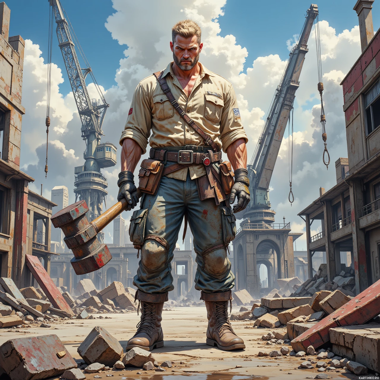 На картинке изображён мужчина, стоящий посреди того, что похоже на последствия битвы или разрушения – судя по обломкам и покосившимся строениям на заднем плане. На нём соломенная шляпа, подтяжки, бандана на шее, сапоги и кожаная куртка с множеством карманов, выдающих в нём закалённого авантюриста или исследователя. В одной руке он держит большой молот, на лице – суровое выражение. Цветовая гамма включает оттенки коричневого, зелёного и намёки на голубой, исходящие от неба над головой.