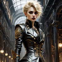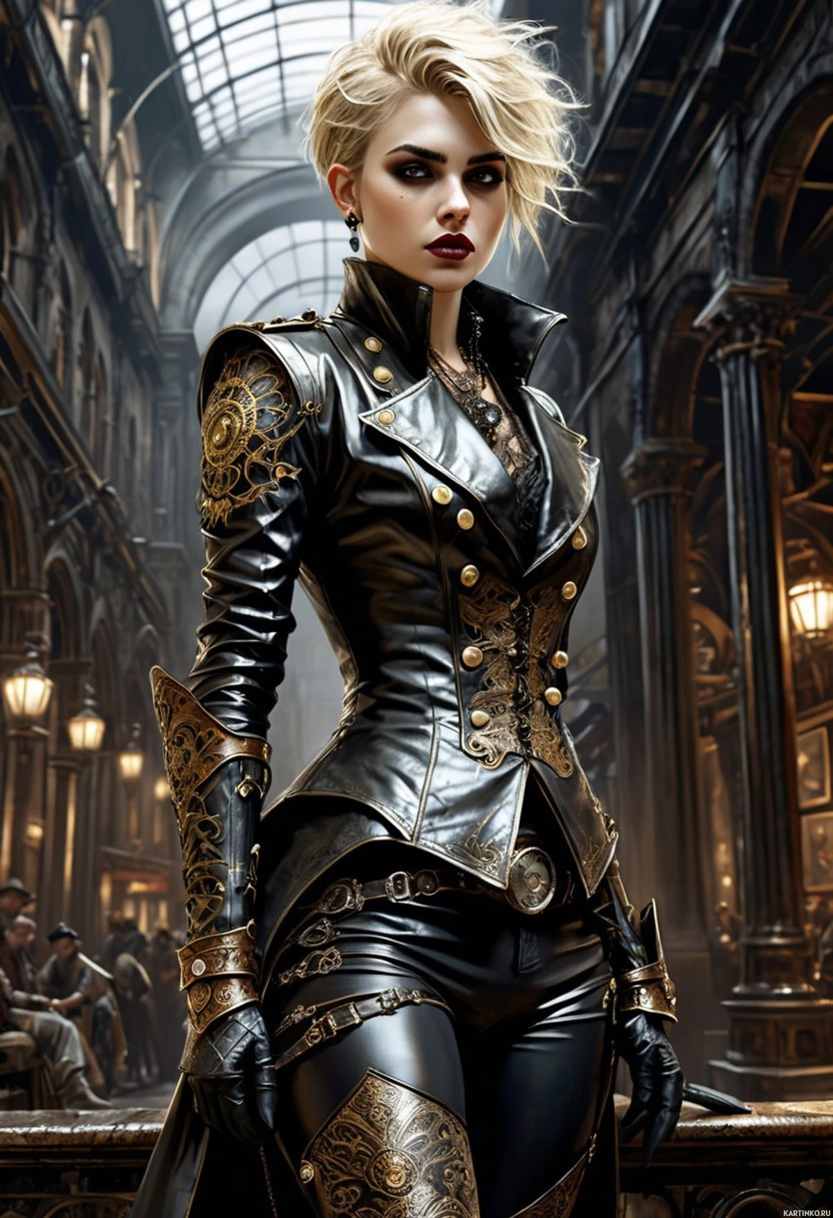 blonde hair and is wearing a black leather outfit with intricate gold detailing, including armor pieces that suggest a historical or fantasy theme. Her expression is serious, and she is looking directly at the viewer. The background includes arches and a high ceiling with stained