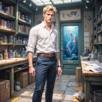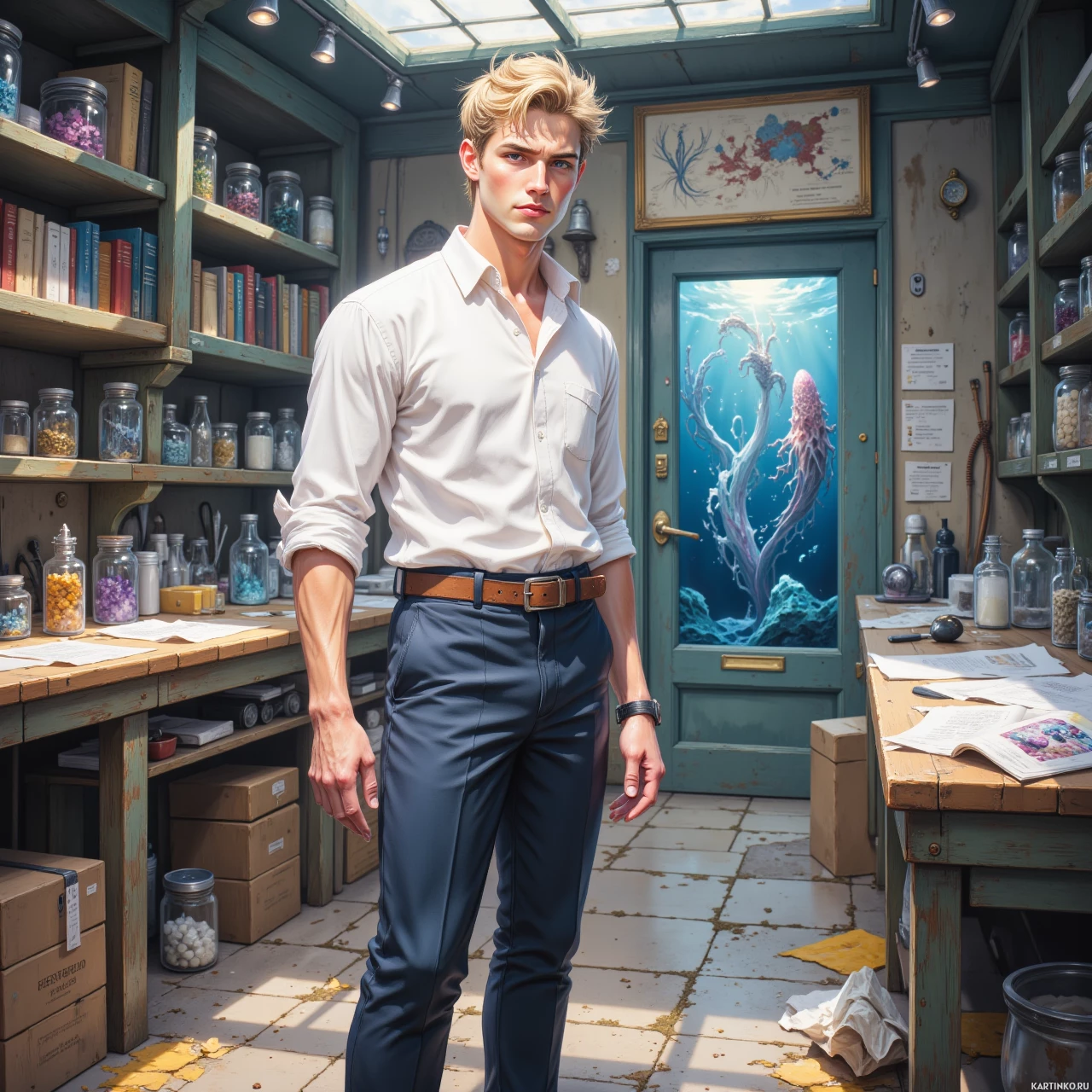 На картинке запечатлен молодой человек, стоящий в помещении, похожего на аптеку или алхимическую лабораторию. На полках позади него – множество бутылочек и книг. Он одет во рубашку, галстук, брюки и жилет, что говорит о деловом стиле одежды. Его поза уверенная, руки лежат вдоль тела. У мужчины светлые волосы, и он смотрит прямо в камеру. На стене висит большая картина с осьминогом, что подчеркивает тематику места. Комната залита естественным светом, что создает ощущение простора и легкости.