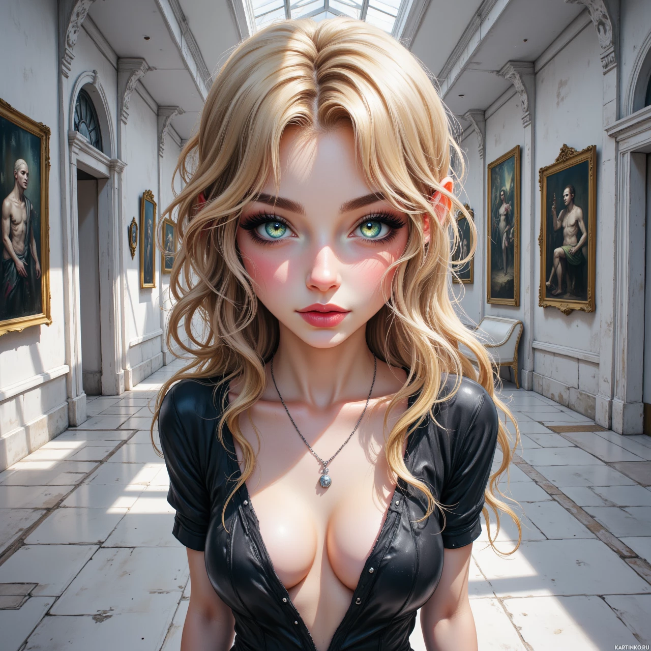 На картинке изображена девушка с светлыми волосами и голубыми глазами. У нее бледная кожа, а выражение лица нейтральное, немного задумчивое. Губы слегка приоткрыты в легкой улыбке, и она смотрит прямо в камеру. Брови слегка приподняты над глазами, придавая ей вид задумчивости или любопытства. На ней, похоже, черный кожаный топ в стиле корсета, который подчеркивает ее грудь благодаря глубокому вырезу. У основания груди видна небольшая подвеска или талисман. Волосы длинные и волнистые, ниспадают на плечи, некоторые пряди закрывают лицо. За ней – интерьер с богато украшенной стеной, на которой висят несколько картин в рамах. Освещение предполагает, что это день, судя по яркости на ее коже.