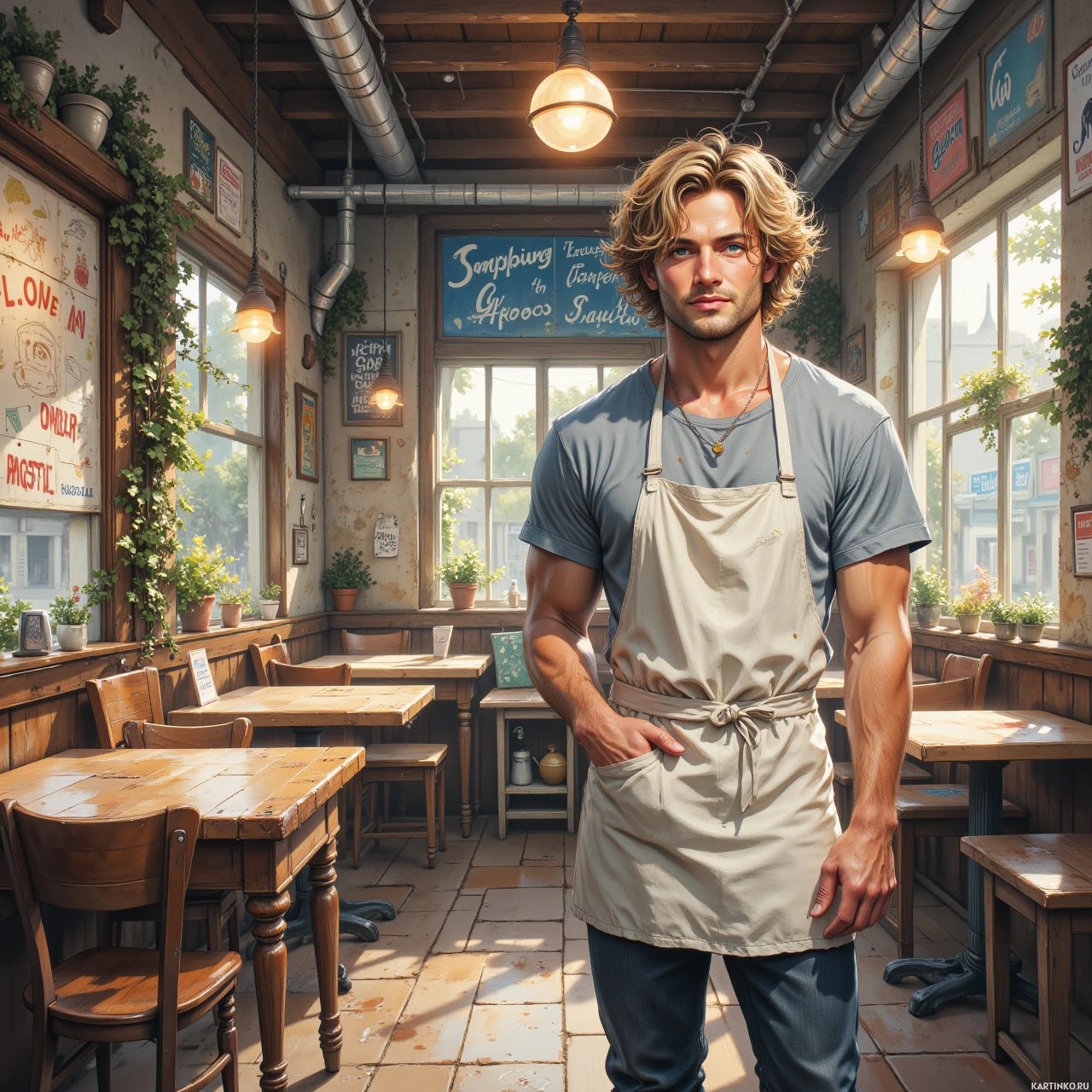 На картинке – молодой человек стоит в интерьере, напоминающем старинную паб или ресторан. У него длинные волнистые светлые волосы и серая футболка. На лице – нейтральное выражение, он смотрит прямо в камеру. Комната залита естественным светом, что говорит о дневном времени суток. За его спиной на стене висят несколько табличек, но что на них написано, в описании не видно. Мебель включает деревянные столы и стулья, что создает ощущение деревенского уюта.