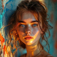 a textured wall behind her which looks like rust-covered metal sheeting. There's a warm