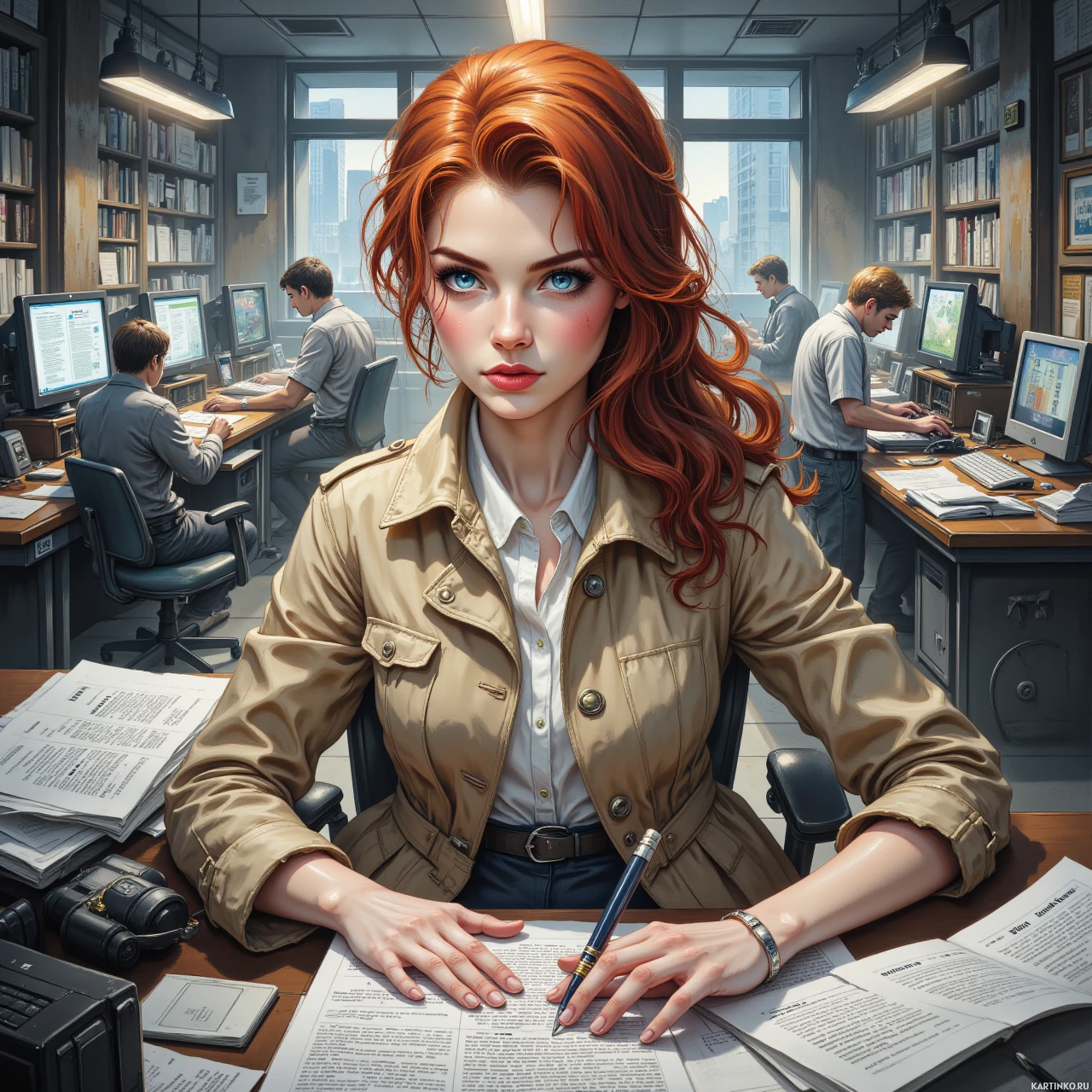 На картинке изображена женщина с рыжими волосами, сидящая за столом в офисе. На ее лице легкая хмурость, и она смотрит прямо на зрителя. Одета она в деловой костюм: пиджак с высоким воротником, блузка и брюки. На заднем плане видны люди, работающие за компьютерами, что создает впечатление оживленного рабочего пространства.