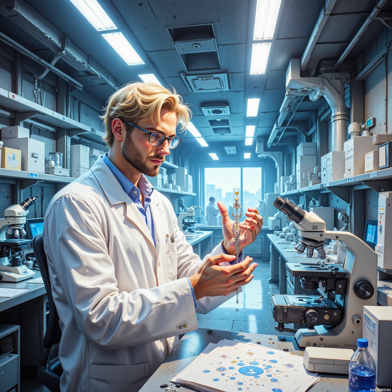 На картинке мужчина с светлыми волосами в очках и белом халате стоит в лаборатории. Слева от него – различные приборы: колбы, пробирки, микроскопы, расставленные на столах. Справа видны полки с банками, наполненными разными веществами. Мужчина, кажется, сосредоточен на чем-то, что держит в руках. Мягкий свет сверху указывает на искусственное освещение.