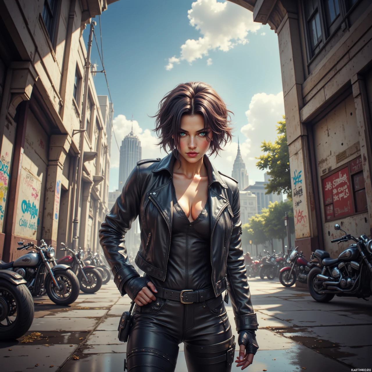 На картинке изображена девушка, стоящая на улице, вокруг нее припаркованы мотоциклы. У нее короткие волнистые каштановые волосы и черная кожаная куртка поверх майки. Выражение лица серьезное, она смотрит прямо на зрителя. За ней угадывается городской пейзаж, здания частично скрыты дымкой или туманом, что создает драматичную атмосферу.