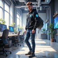 На картинке двое мужчин стоят в офисе. Мужчина слева одет неформально: на нем толстовка с синим принтом и рюкзак через плечо. У него короткие волосы, и он смотрит в сторону с нейтральным выражением лица. Мужчина справа, похоже, среднего роста, тоже одет в джинсы, и у него более расслабленная поза, он смотрит прямо перед собой. Вокруг них – офисное пространство с desks, оборудованными компьютерными мониторами и клавиатурами, что говорит о современном рабочем месте, которое может использоваться для цифровых задач или игр, учитывая наличие компьютеров. В комнате также горшки с растениями, добавляющими зелени, и на одной из стен – большой экран с красочными графиками, которые могут быть частью презентации или игры. В целом атмосфера чистая и светлая, с естественным освещением из окон, невидимых на картинке.