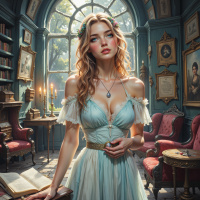 На картинке изображена женщина с длинными светлыми волосами, стоящая в помещении, похожем на кабинет или библиотеку. На ней – детализированное платье в историческом стиле с пышными рукавами и высоким воротником. Её взгляд задумчив, она смотрит в сторону. Позади неё – книжные полки, заполненные книгами и различными предметами; некоторые из них обрамлены резными рамами и напоминают картины или гравюры. Комната пронизана атмосферой старины благодаря тёмным деревянным панелям, изящной мебели и тёплому освещению. Рядом с ней на столе горит одинокая свеча, добавляя уюта.