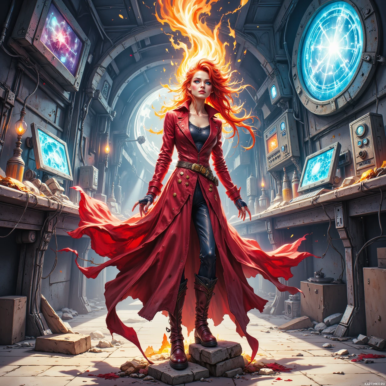 Картинка с девушкой с красными волосами в красном пальто с воротником и брюками с высокой талией и черным поясом уверенно стоит на фоне промышленного пейзажа. Вокруг нее – машины и экраны с цифровыми данными. На голове у нее языки пламени, а вокруг тела – огненное сияние, что намекает на ее связь с огненной стихией.