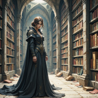 Молодая женщина стоит в величественной библиотеке, заполненной рядами книг на полках. На ней длинное темное платье, а волосы уложены. Кажется, это время сумерек или рассвета, свет мягкий и приглушенный, отбрасывающий длинные тени.