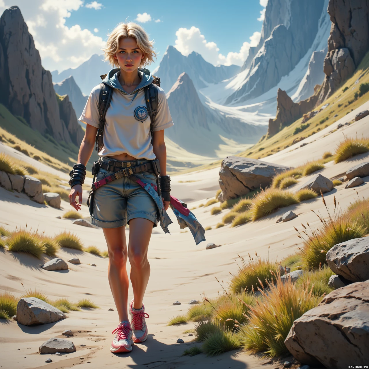 A young woman with blonde hair stands in the center of a rocky landscape featuring steep mountainous terrain under a blue sky with clouds. She is wearing a white shirt, shorts, and sneakers, and has a backpack on her shoulders. In front of her are rocks and plants typical of an alpine environment.