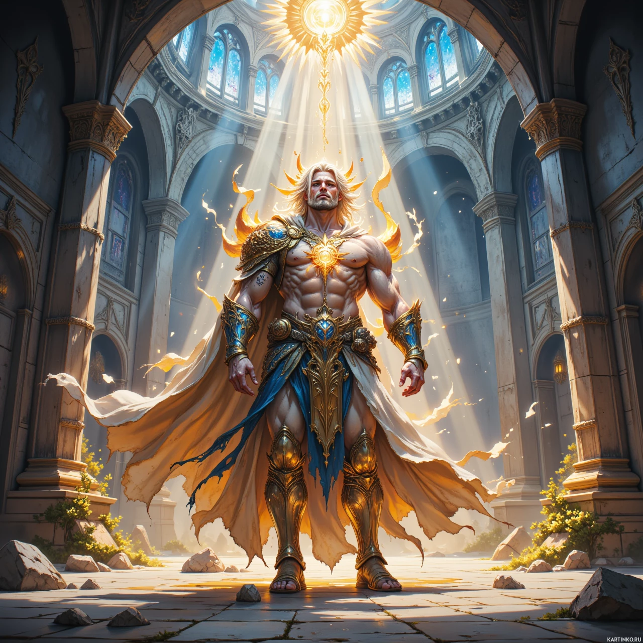 Картинка изображает фантастическую сцену с мускулистым воином в центре. Он стоит в величественной, открытой аркой конструкции, похожей на собор или храм с высоким потолком и витражными окнами, через которые сверху проникают лучи света. Воин облачен в древние доспехи с золотыми акцентами, на его нагруднике – замысловатый узор, а на плечах – мантия, подчеркивающая его царственный вид. Его одежда указывает на мифологического или легендарного персонажа, возможно, бога или высокопоставленную фигуру в мире фэнтези. Фон слегка размыт, что помогает выделить воина как главный объект картинки.