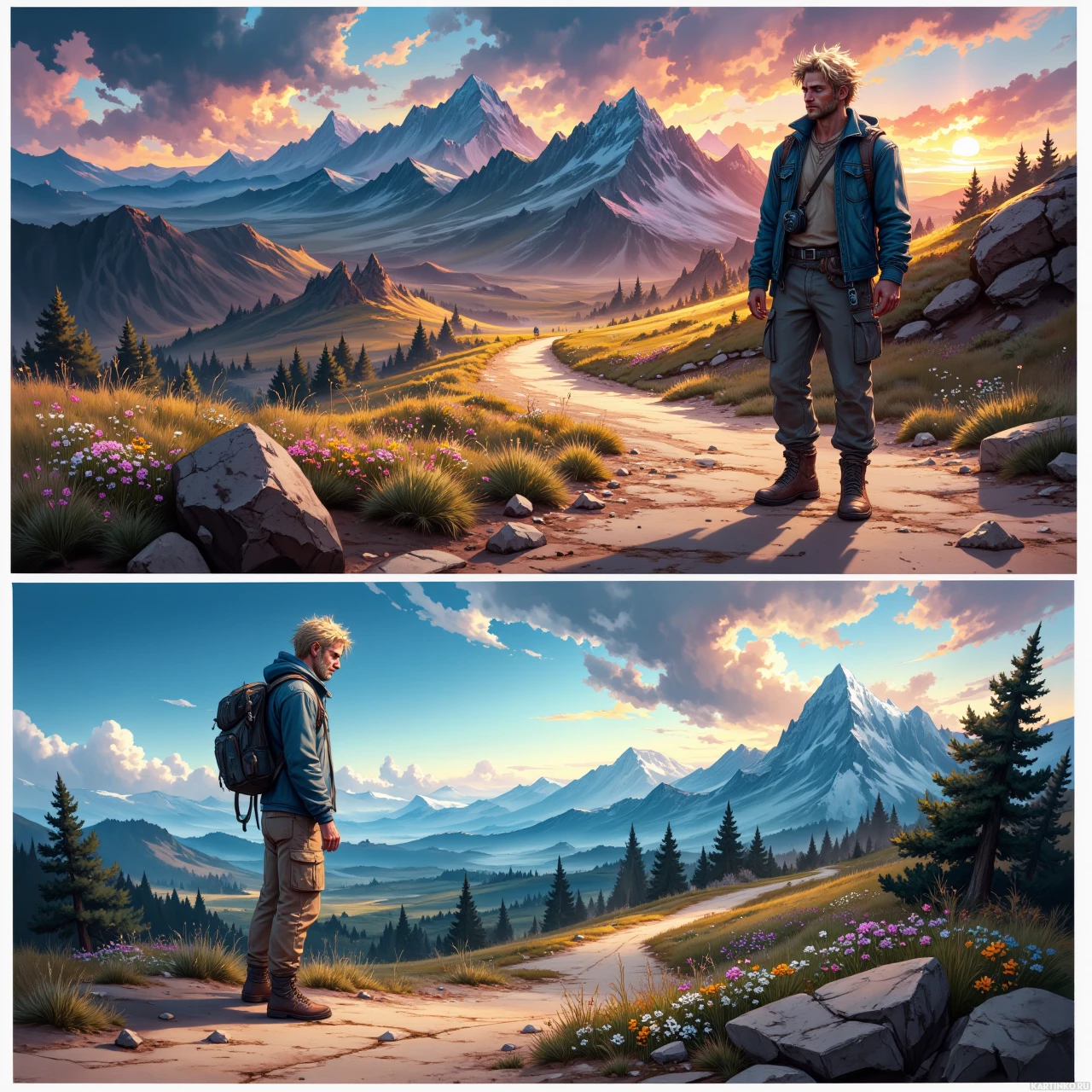 В картинке, расположенной вверху коллажа, молодой человек с светлыми волосами в синей куртке стоит на скалистом выступе, с которого открывается живописный вид на долину. Кажется, он задумался, его взгляд направлен в сторону. Вокруг него пышная зелень, вдали виднеются горы под ясным небом. Вторая картинка коллажа показывает того же молодого человека, сидящего на каменной скамейке, как будто установленной специально для обзора долины. Он одет так же, но снял рюкзак, что говорит о моменте отдыха или размышлений. Солнечный свет наполняет сцену теплыми оттенками, подчеркивая безмятежную атмосферу. Третья картинка возвращает нас к позе стоящего человека, но теперь он на тропинке, извиваясь среди долины. Рюкзак все еще на плечах, что может говорить о начале или завершении путешествия. Долина кажется залитой золотым светом, возможно, на рассвете или закате, придавая сцене неземную красоту. В четвертой и последней картинке сохранена поза стоящего человека, но теперь он стоит на прямой тропинке, ведущей, кажется, прямо к зрителю. Рюкзак все еще виден, и его взгляд по-прежнему направлен в сторону, как будто он смотрит на что-то за кадром, возможно, обдумывая предстоящее путешествие или вспоминая пережитое во время прошлых поездок по этому великолепному пейзажу.