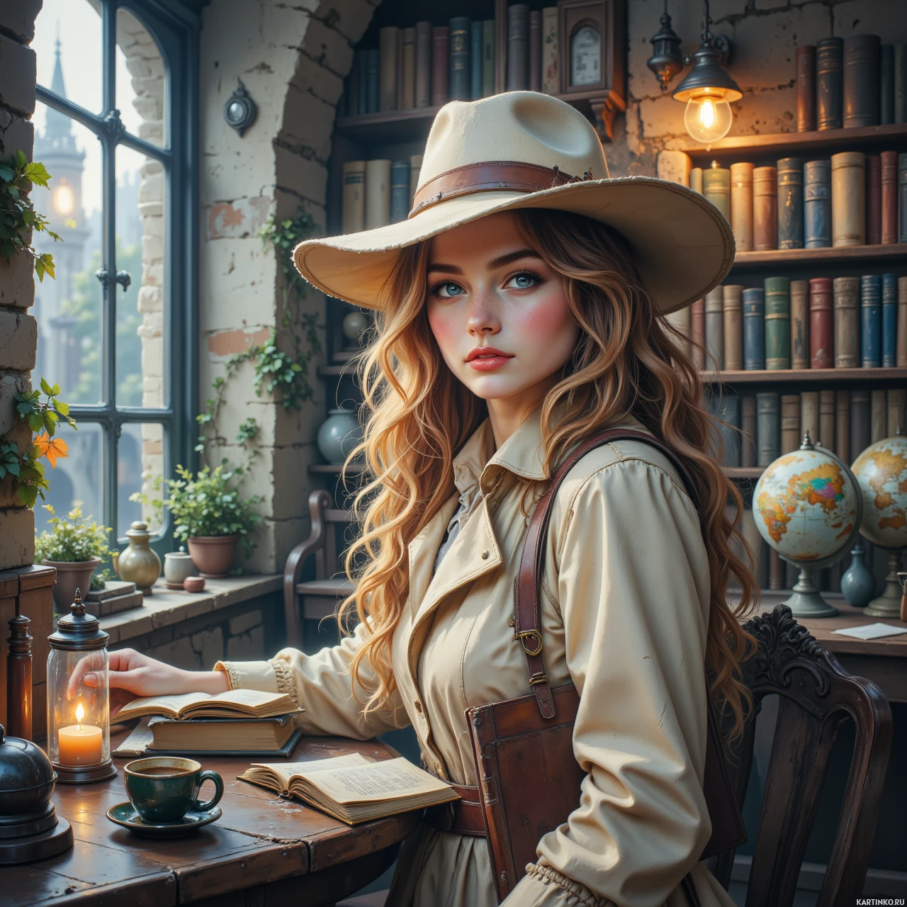 На картинке молодая женщина с светлыми волосами сидит за столом, по-видимому, в кабинете или библиотеке. На ней широкополая шляпа и коричневый тренч поверх рубашки. В руках она держит открытую книгу, словно читает или учится. Рядом со столом стоят два вазы с одиночными цветами, создающими спокойную атмосферу. За её спиной стена, заставленная книгами, и над книжным шкафом висит старинная карта. В целом картинка создает ощущение тихой сосредоточенности и интеллектуального поиска.