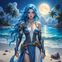 На картинке изображена молодая женщина, стоящая на песчаном пляже ночью. У неё длинные голубые волосы, и она одета в фантазийные доспехи с металлическими элементами, по стилю напоминающие персонажа из видеоигры или фэнтезийной истории. Доспехи включают наплечники, сапоги и, по всей видимости, нагрудник. Взгляд у неё направлен в камеру, выражение лица нейтральное. На заднем плане — лунное небо, на фоне которого силуэтами видны пальмы. Небольшие волны тихо плещутся о берег, создавая спокойную атмосферу.