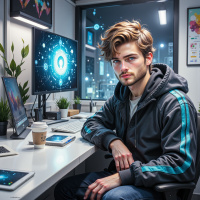 На картинке изображен молодой человек, сидящий за столом в офисе. У него каштановые кудри, и кажется, он смотрит прямо в камеру с легкой задумчивостью. На нем серая куртка с синими полосками по бокам и синие джинсы. На столе перед ним – ноутбук, смартфон, чашка кофе и, кажется, небольшой цветок в горшке. За его спиной – большой монитор с графиками и данными, а также стена, украшенная постерами или принтами. Общая атмосфера указывает на современное, технологичное рабочее пространство.