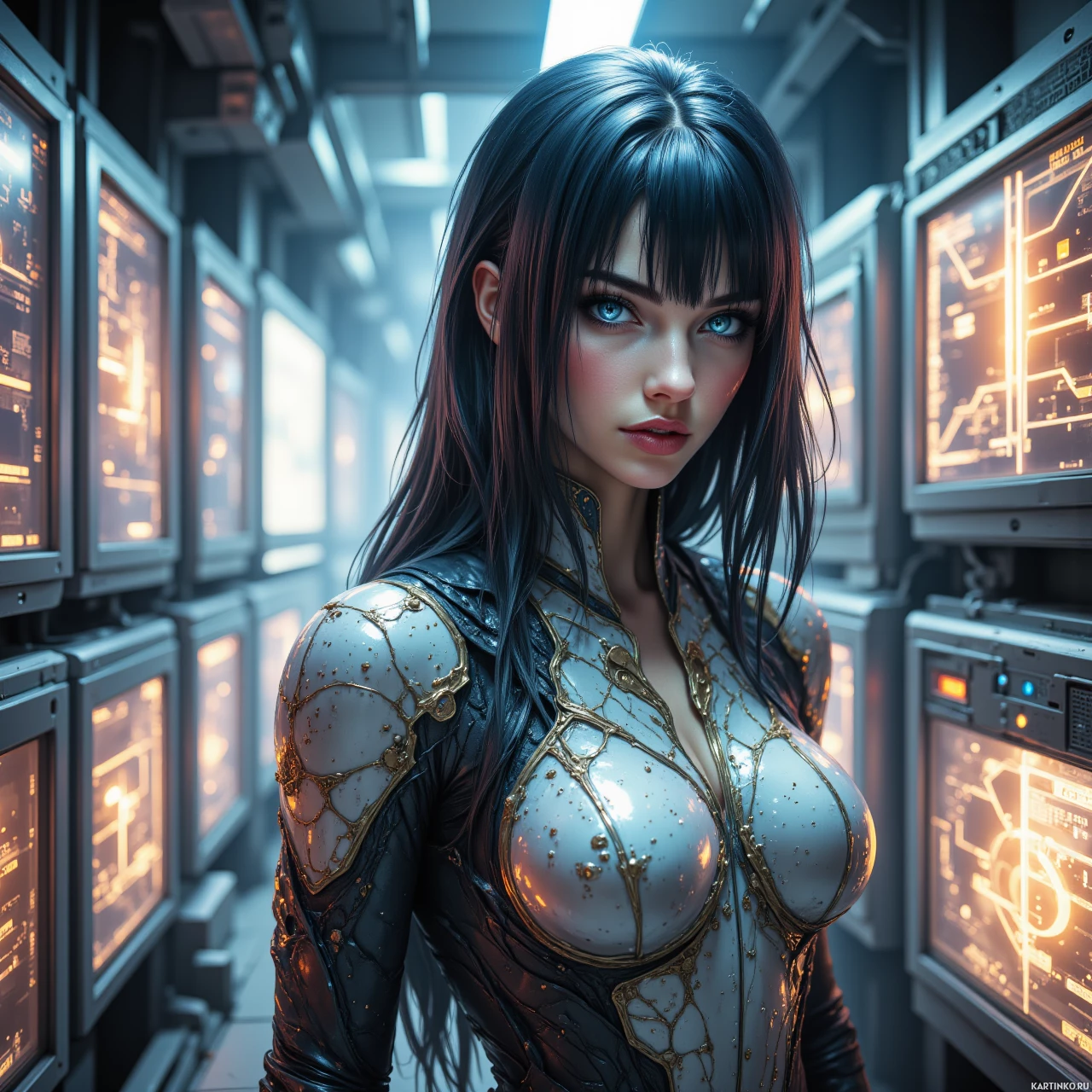 На картинке изображена женщина с длинными чёрными волосами и голубыми глазами. У неё задумчивое выражение лица, она смотрит немного в сторону, слегка наклонив голову. Макияж подчеркивает её глаза и губы. На ней футуристический костюм, словно сделанный из металла, с замысловатыми узорами. Костюм включает в себя элементы брони на плечах, груди и руках, а также металлический корсет, опоясывающий её торс, и нагрудник. Ног на картинке не видно. На заднем плане – ряд компьютерных мониторов, на которых отображаются различные экраны с техническими схемами или информацией. Освещение указывает на промышленную обстановку, возможно, командный центр или диспетчерская в научно-фантастическом антураже.