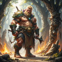 На картинке изображён мускулистый мужчина в доспехах фэнтези-воина с полной бородой и длинными волосами. На нём шлем, нагрудник и щит с замысловатым узором. В левой руке он держит большой, богато украшенный топор, а в правой – меч в ножнах, сделанных, похоже, из кожи или похожего материала. Действие происходит на открытом воздухе: мужчина стоит на вершине скалы среди дикой природы, где растут высокие деревья с мощными стволами и пышной зеленью. Окружающая обстановка напоминает густой лес или, возможно, древнее поле битвы.