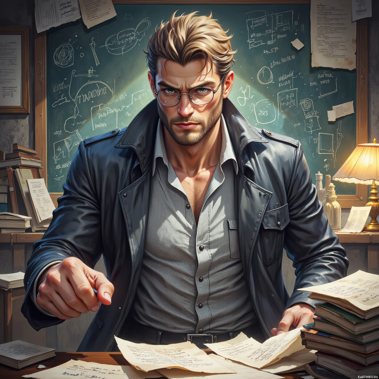 Мужчина сидит за столом, заваленным бумагами, и одной рукой жестикулирует в сторону ещё одного листа. На нём очки, костюм, а на спинку стула накинута кожаная куртка. В картинке чувствуется атмосфера старины: мужчина выглядит как учёный или увлечённый интеллектуал.