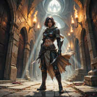 На картинке изображена девушка, по всей видимости, из фэнтезийного мира. У неё короткие каштановые волосы, и она одета в доспехи в средневековом стиле: на ней нагрудник, наручи, шлем, а на спине – меч. Доспехи выглядят поношенными, будто побывали в битвах или служили долгое время. Девушка стоит в полумрачном помещении с каменными стенами, освещенном, кажется, факелами, висящими под потолком.
