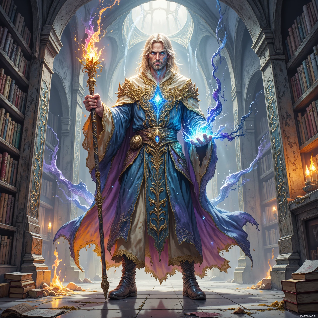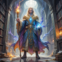 На картинке изображен мужчина, стоящий в помещении, напоминающем мистическую библиотеку или кабинет, где повсюду сложены книги и свитки. На нем богатые одеяния, подчеркивающие его магический или королевский статус, включая накидку и, по всей видимости, посох или волшебную палочку в левой руке. Его правая рука поднята, словно он произносит заклинание, и из его ладони вырываются искры магии. Общая атмосфера пронизана мистикой и силой.