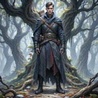 На картинке изображен мужчина, стоящий в лесистой местности с высокими, искривленными деревьями, корни которых образуют сложную сеть у его ног. На нем доспехи, напоминающие исторический или фэнтезийный стиль, включая длинный плащ с красными деталями и пояс с крупной пряжкой. У мужчины короткие волосы, он смотрит в сторону, а не прямо на зрителя, и его поза выражает готовность и настороженность. Выражение его лица серьезное, что создает общее впечатление силы и стойкости.