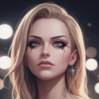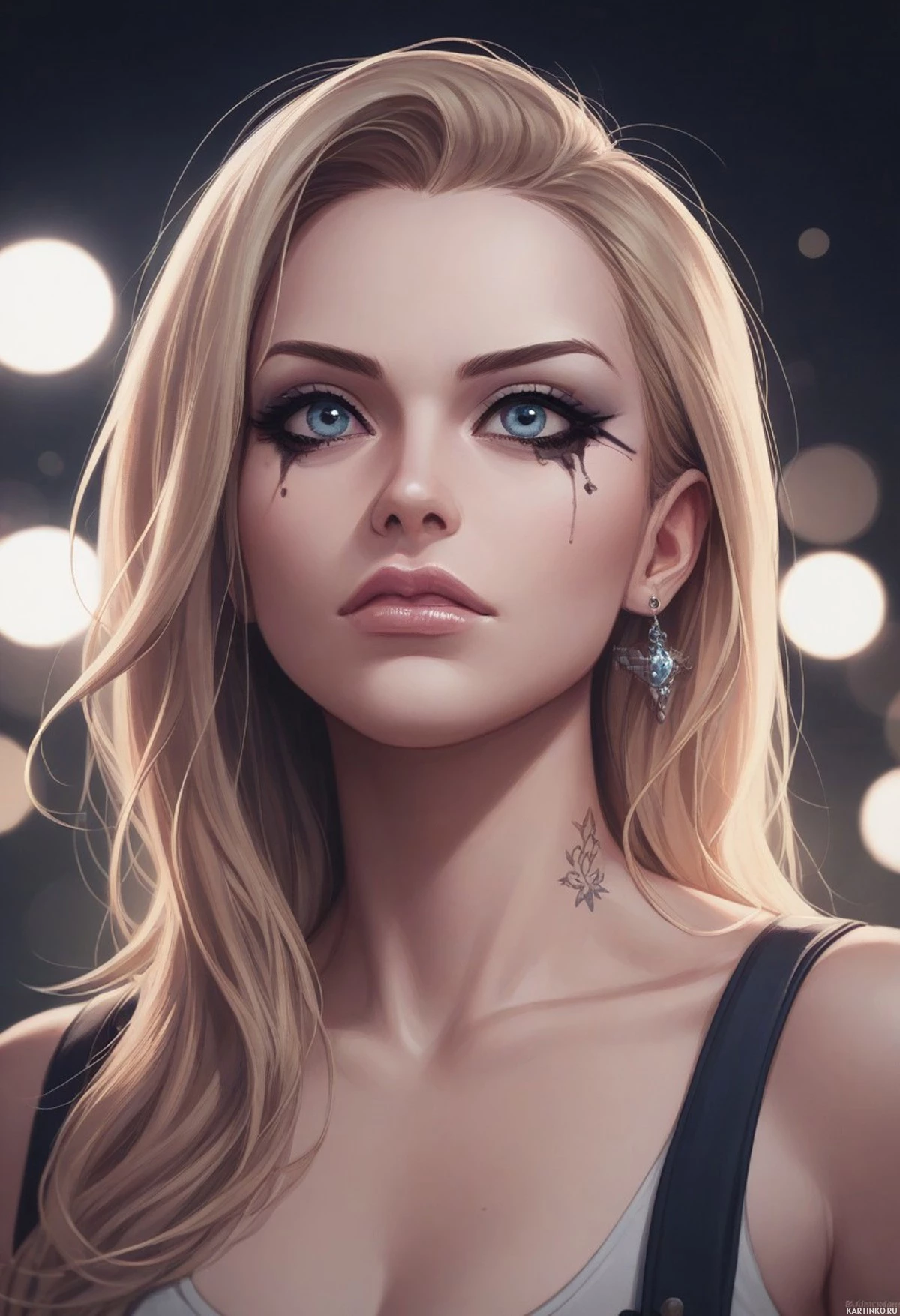 blue eyes and her makeup includes dramatic teardrops painted on her cheeks, which may suggest a character from a comic book or video game. The woman is wearing earrings that appear to be of a fantasy or superhero design. Her expression is neutral, and she is looking directly at the viewer. The background has