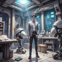 In the image, a young man stands in a room that exudes a sense of advanced technology and scientific exploration. He is positioned centrally, with his hands clasped in front of him and his head slightly tilted as if he's observing something intently. His attire is formal yet practical for the setting: a sleek gray suit paired with dark shoes. To his left, a robotic arm rests on a desk, suggesting recent use or activity. The desk itself is cluttered with various electronic devices and equipment, hinting at an ongoing project or experiment. A monitor displaying lines of text sits nearby, adding to the overall atmosphere of technological endeavor. To his right, another robotic arm stands upright, as if poised for action. It's a large structure with a smooth surface and blue lights at its base, giving it an almost humanoid appearance. This arm is not resting but appears ready to move or perform a task at any moment. The room itself has an industrial feel, with exposed pipes running along the ceiling and walls adorned with monitors displaying data in real-time. The floor is made of concrete, adding to the rugged yet precise aesthetic of the space. Every object in this image has been carefully placed, creating a scene that is both futuristic and grounded in reality. The man's pose and expression suggest that he might be an engineer or scientist deeply engaged in his work.