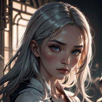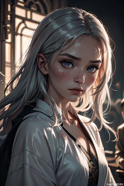 На картинке запечатлена молодая женщина с белыми волосами, смотрящая вправо. У неё светлая кожа, тёмные глаза и невозмущённое выражение лица. Волосы уложены лёгкими волнами, ниспадающими на плечи. Под глазами заметны тени, что указывает на возможное нахождение в помещении с приглушённым освещением. На ней одето платье, сочетающее элементы исторического и современного стиля. Верхняя часть — без рукавов, открывающая ключицы и часть груди, нижняя — напоминает корсет или структурированную подблузку с кружевными деталями. Вокруг шеи – лямка, возможно, от рюкзака или сумки, которая не полностью видна на картинке. Цветовая гамма изображения приглушённая, что придаёт ей слегка мрачную атмосферу.