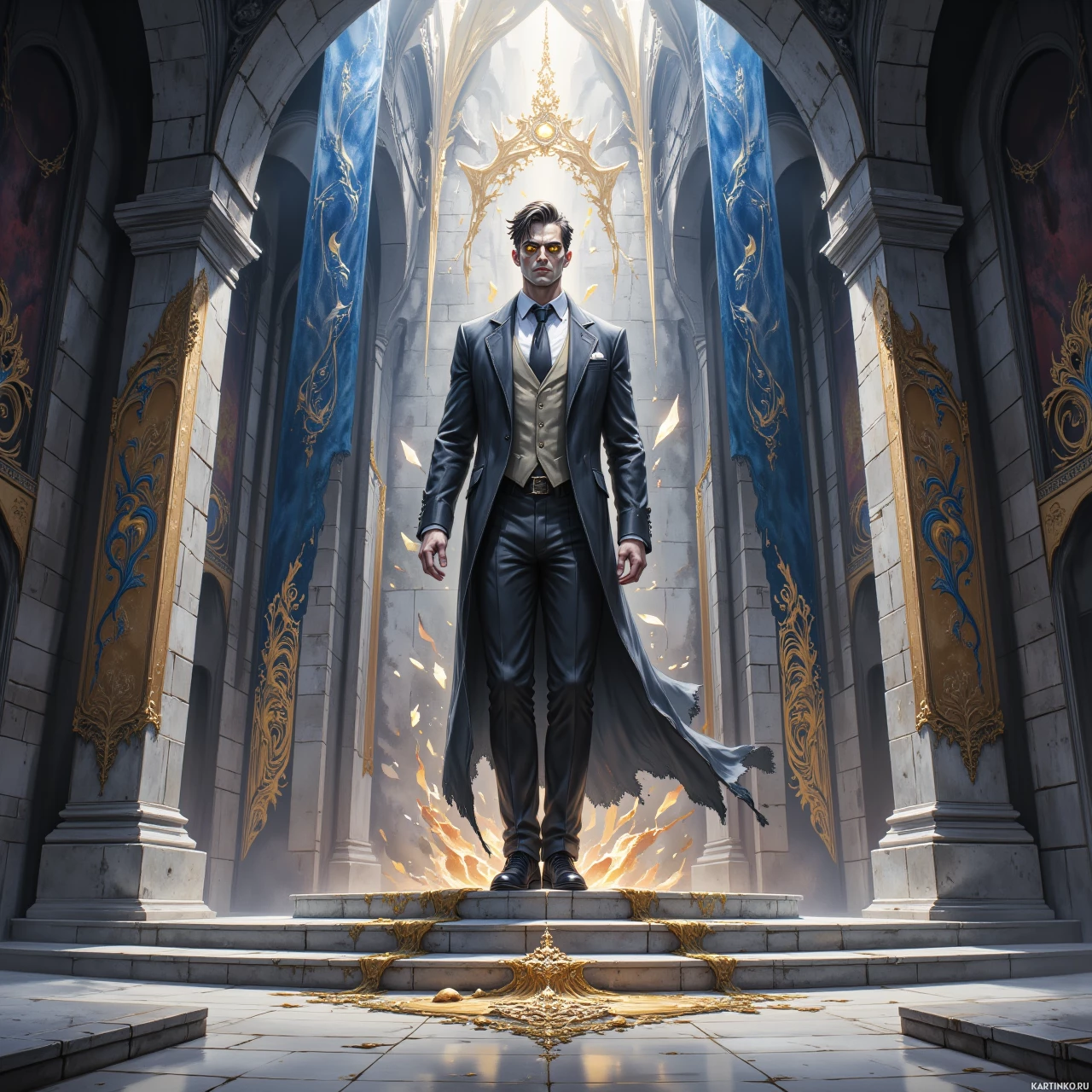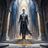 На картинке изображен человек, стоящий перед богато украшенной архитектурной постройкой, напоминающей ворота замка. Судя по всему, это мужчина, одетый в строгий костюм: темный пиджак, белая рубашка и черный галстук. На заднем плане видны витражи и сложная каменная кладка, что создает атмосферу фэнтези или исторического романа.