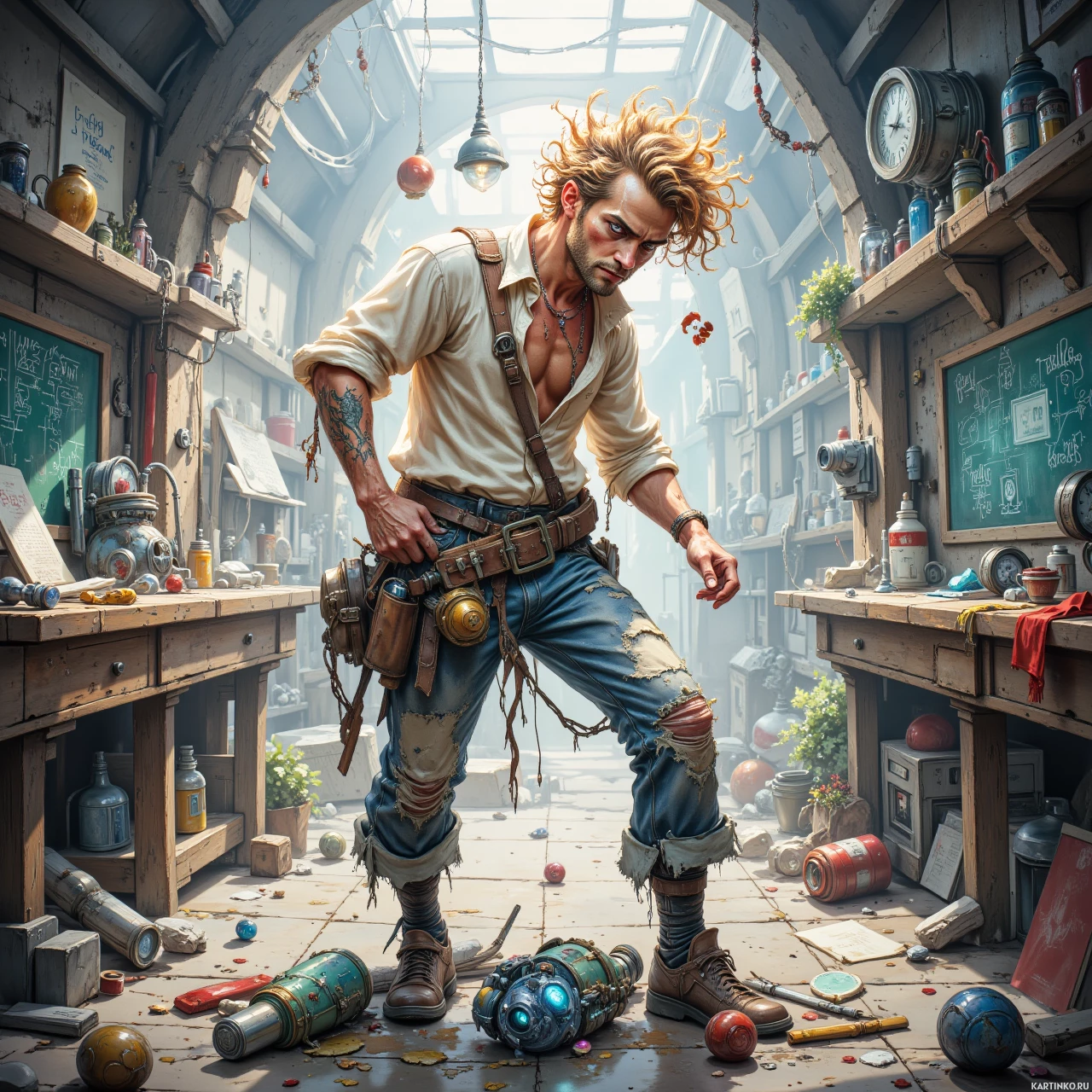 На картинке мужчина с растрепанными волосами и бородой стоит в центре комнаты, заполненной научным оборудованием. На нём джинсы, зафиксированные коричневыми подтяжками, и коричневые ботинки. На его левой руке перчатка из кожи. Комната выглядит как лаборатория: повсюду разбросаны колбы, стаканы и флаконы. На одной из полок лежит раскрытая книга, а на столе рядом – закрытая. На стене висят научные схемы, что подчёркивает тематику обстановки. Расположение мужчины в центре делает его главным объектом на картинке.