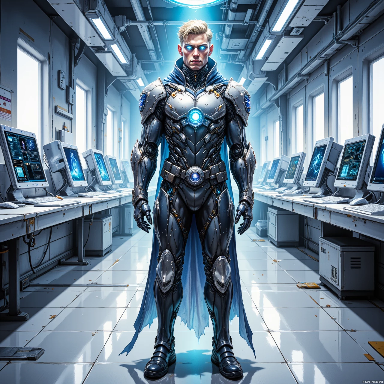 На картинке изображен главный герой, мужчина в футуристических доспехах в стиле научной фантастики. Доспехи преимущественно серебристые и черные, с видимыми схемами и механическими деталями, указывающими на передовые технологии или кибернетические улучшения. Персонаж уверенно стоит в центре комнаты, напоминающей высокотехнологичную лабораторию или центр управления. Перед ним расположены консоли с многочисленными компьютерными экранами, отображающими данные или интерфейсы, возможно, связанные с его заданием или окружающей средой. Освещение яркое, царит атмосфера передовых технологий. Общий антураж предполагает футуристический сценарий, где такие персонажи – обычное явление в обществе или в космических исследованиях.